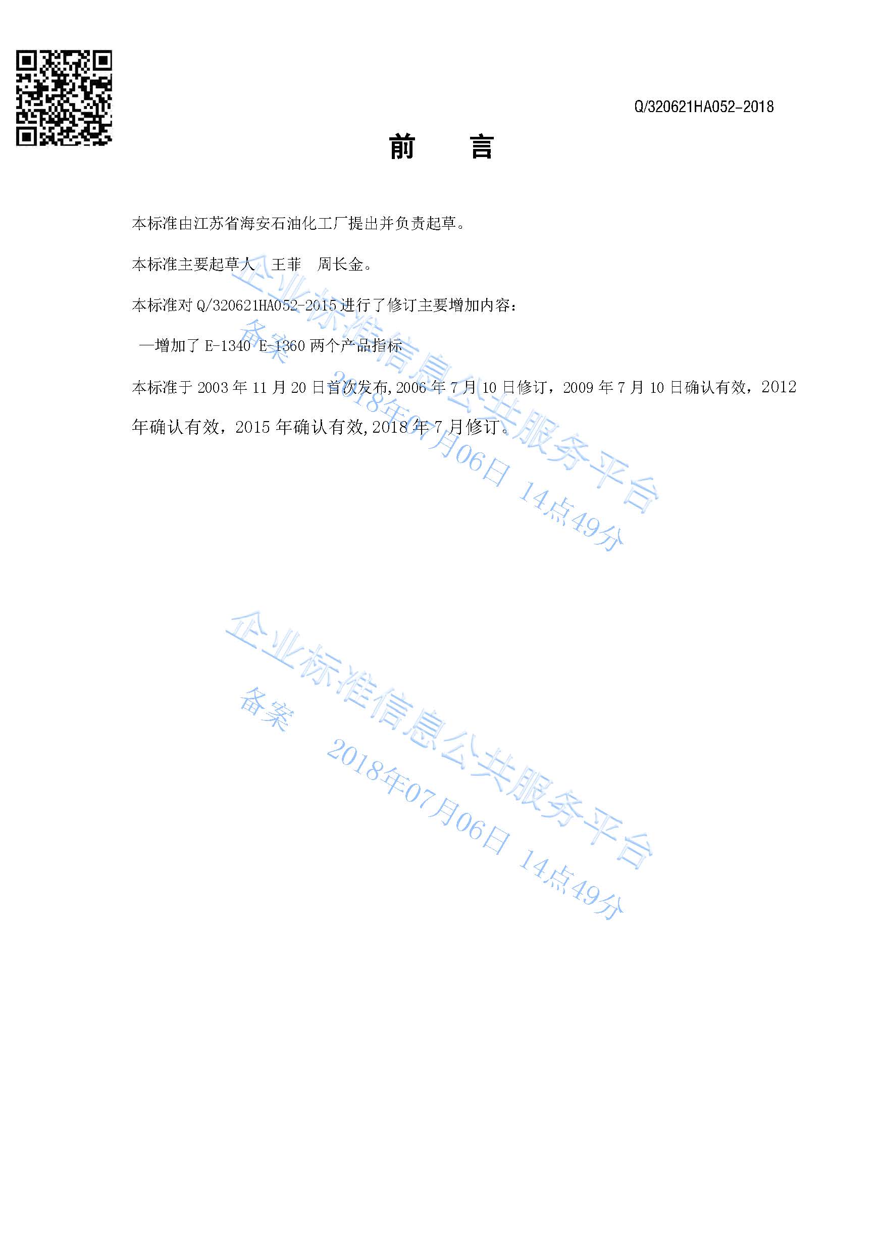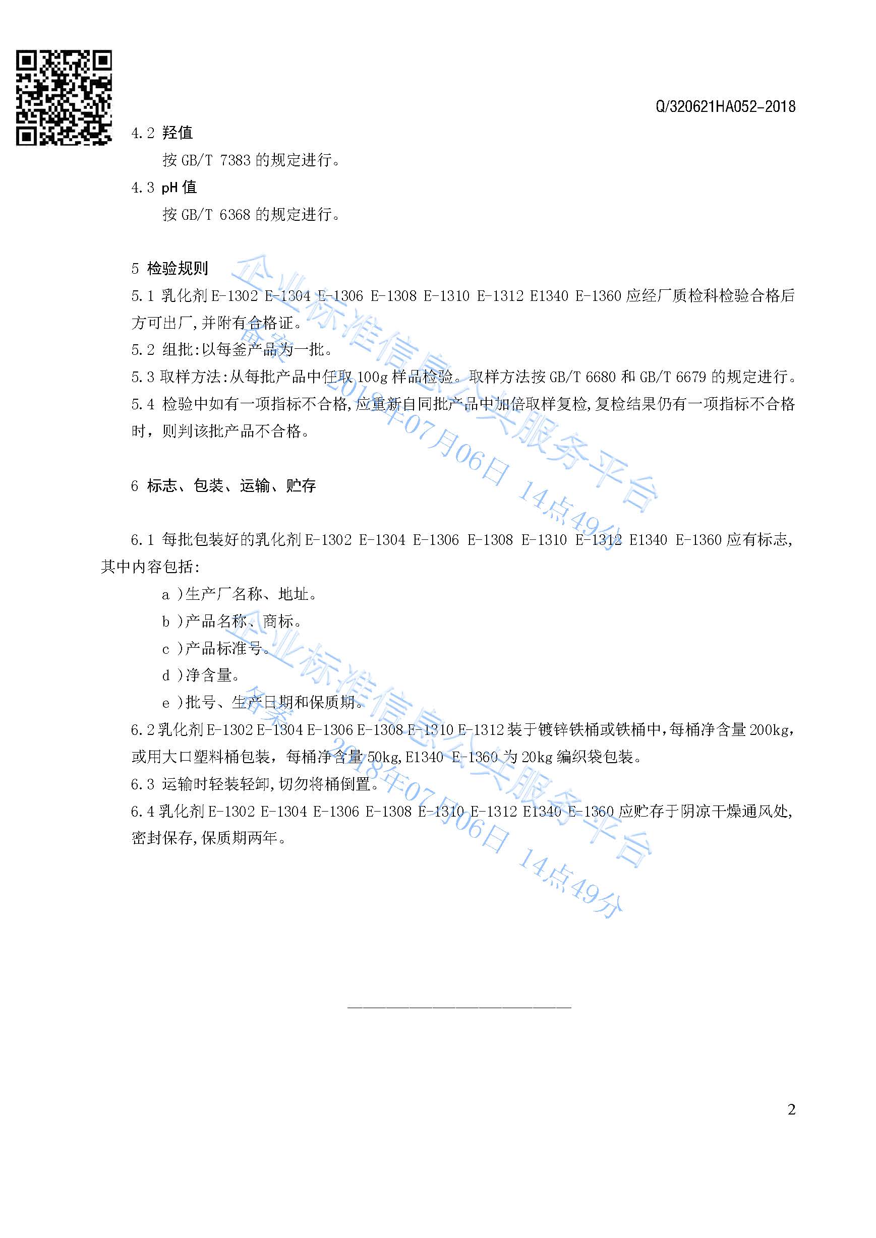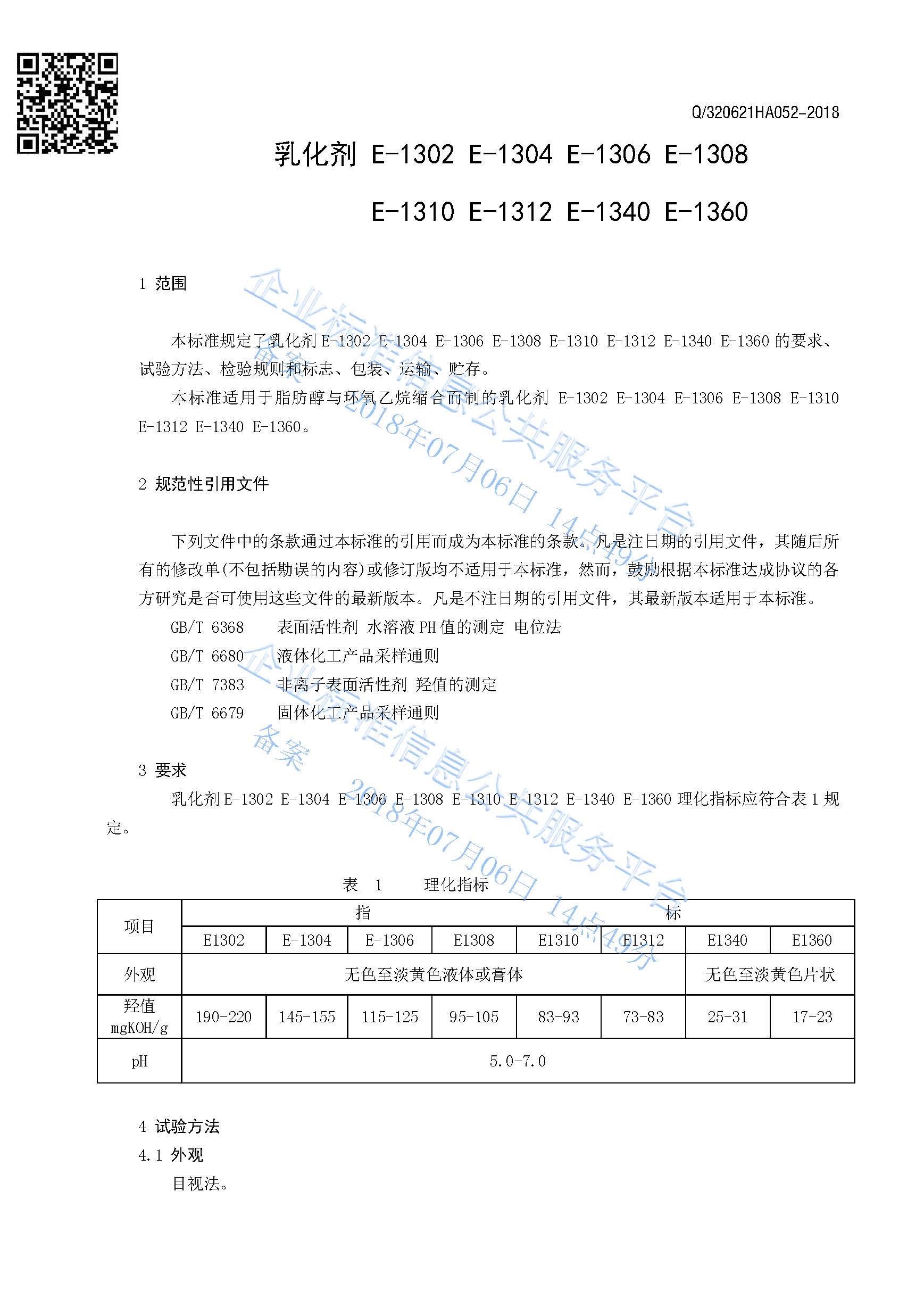 Q/320621HA052-2018 乳化剂E-1302 E-1304 E-1306 E-1308 E-1310 E-1312 E-1340 E-1360产品标准