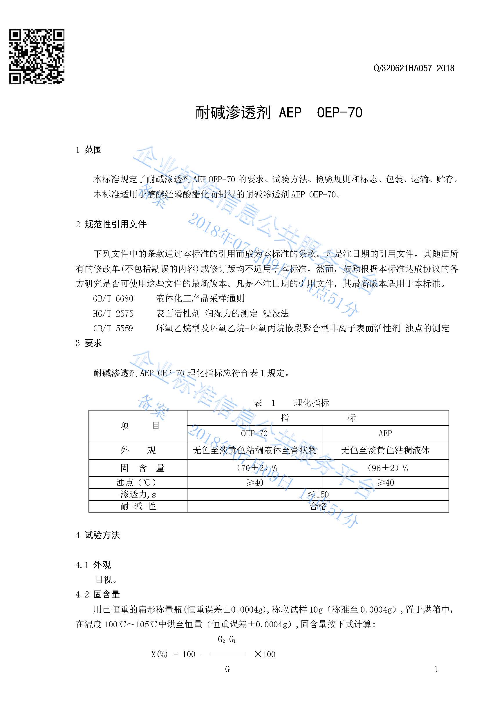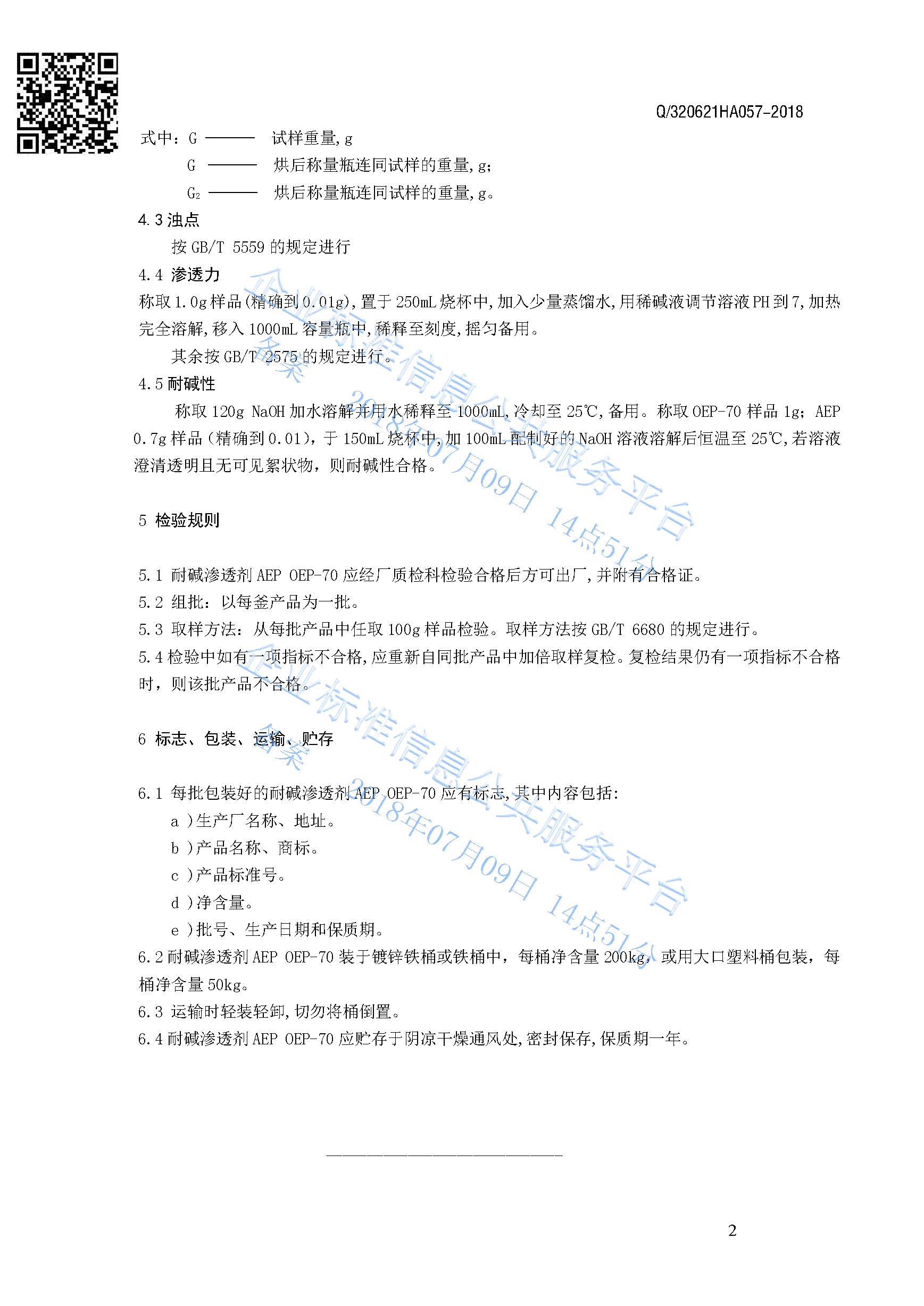 Q/320621HA057-2018 耐碱渗透剂AEP OEP-70产品标准