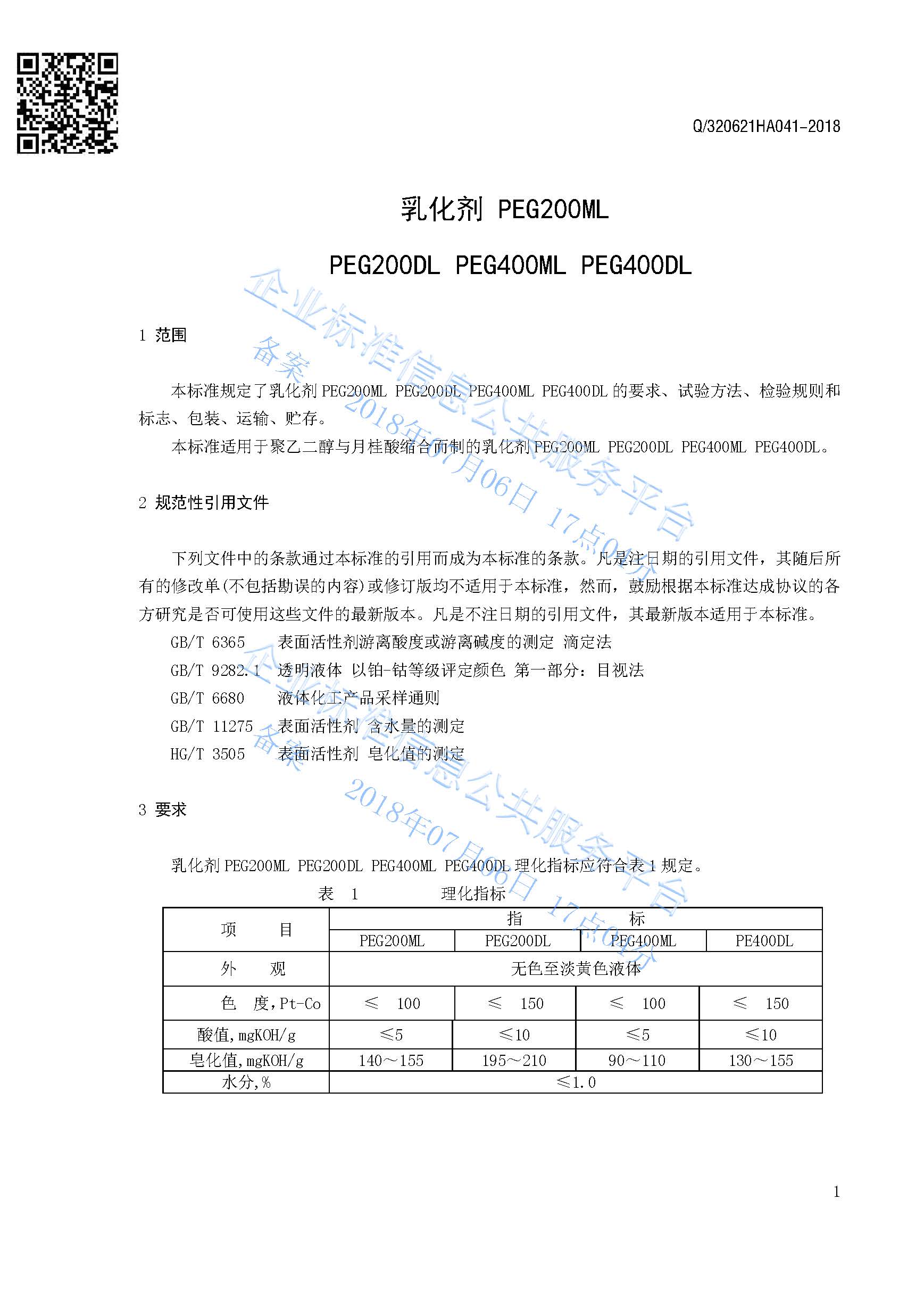 Q/320621HA041-2018 乳化剂PEG200ML PEG200DL PEG400ML PEG400DL产品标准